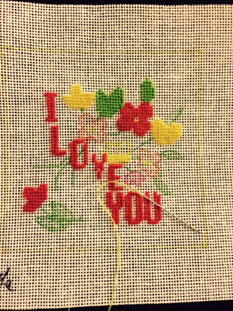 Three very simple pieces. They were unfinished cross-stitch pieces, but she’d done the red flowers and the words “I Love You.”